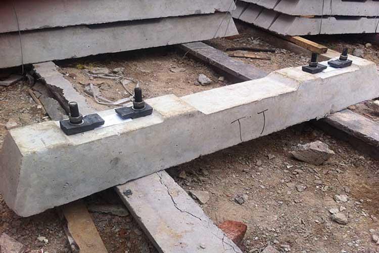 栓壓板型的水泥枕木是用T型螺栓從軌枕下面預(yù)留孔中穿出上面固定住壓板壓住鋼軌,一根軌枕需要4套螺栓,4個(gè)壓板,2個(gè)橡膠墊板,這種軌枕養(yǎng)護(hù)方便,可以重復(fù)利用。